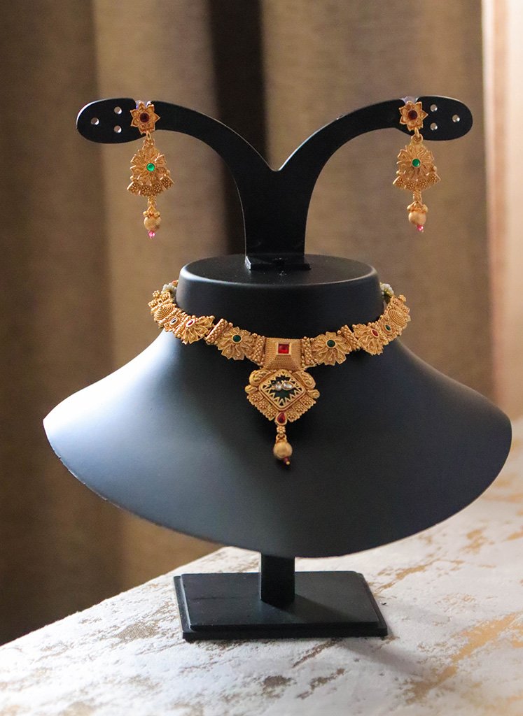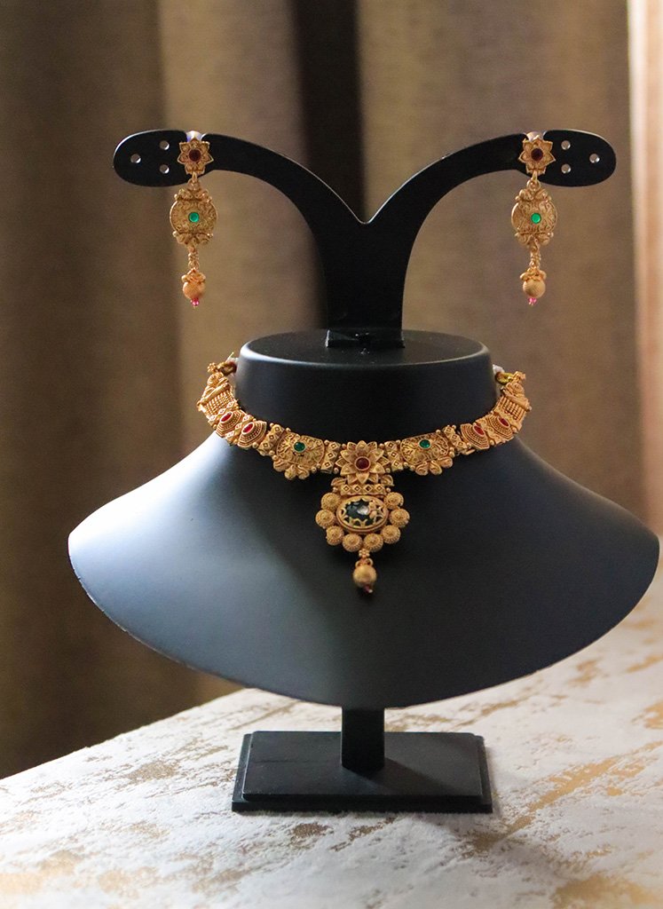 Embrace heritage with the Aira Temple Gold Choker Set, a stunning tribute to traditional craftsmanship. This set features a matte gold-finish choker and matching drop earrings, designed with intricate textures that capture the essence of antique artistry.