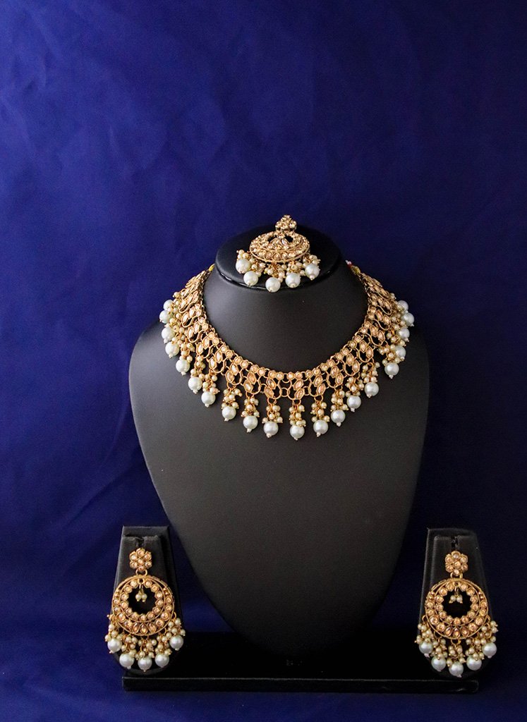 Radiate timeless grace with the Noor Pearl & Polki Heritage Set, an exquisite jewelry collection designed for the modern woman who cherishes traditional roots. This opulent ensemble features a wide, intricately detailed choker, a matching Maang Tikka, and grand circular drop earrings.