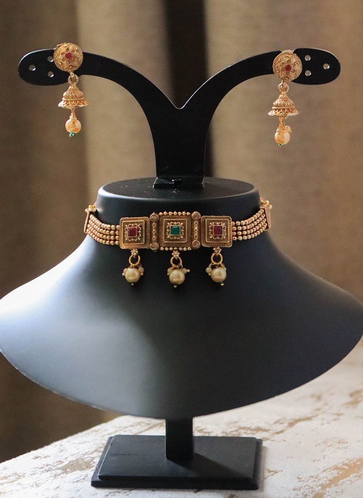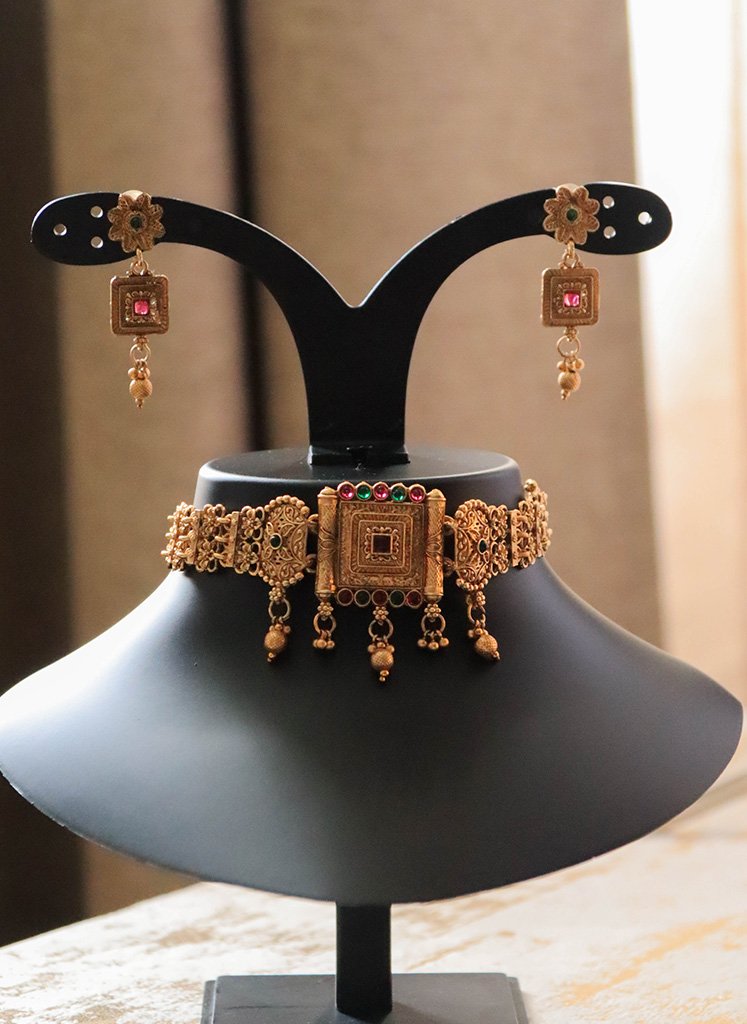Versatile Design: Choose between the classic broad-band choker with antique drops or the multi-strand beaded styles featuring Jhumka-style or square-drop earrings.