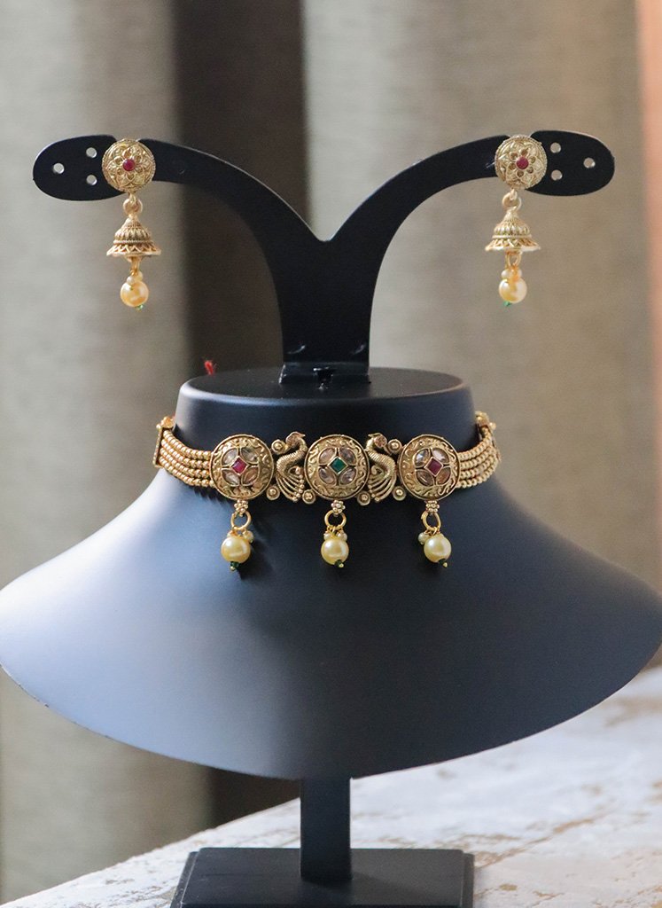 Elevate your ethnic wardrobe with our Rajwada Heritage Collection, a stunning array of antique gold-finished jewelry sets that marry traditional Indian artistry with contemporary elegance. Each set features a meticulously crafted choker and matching statement earrings, designed to be the centerpiece of your festive or bridal attire.
