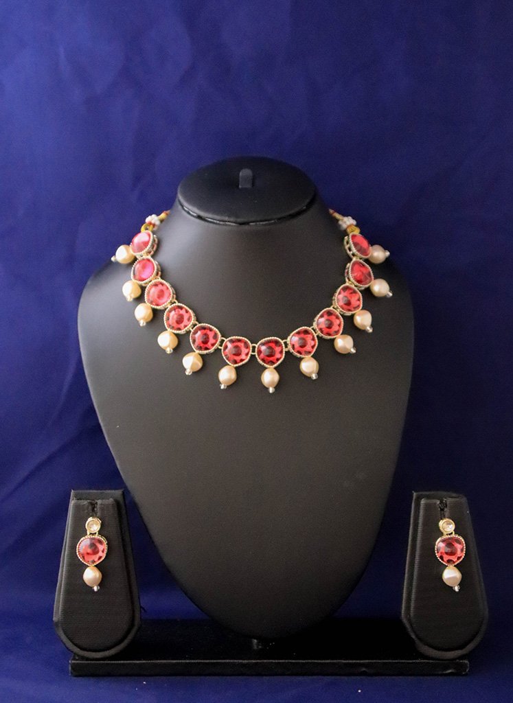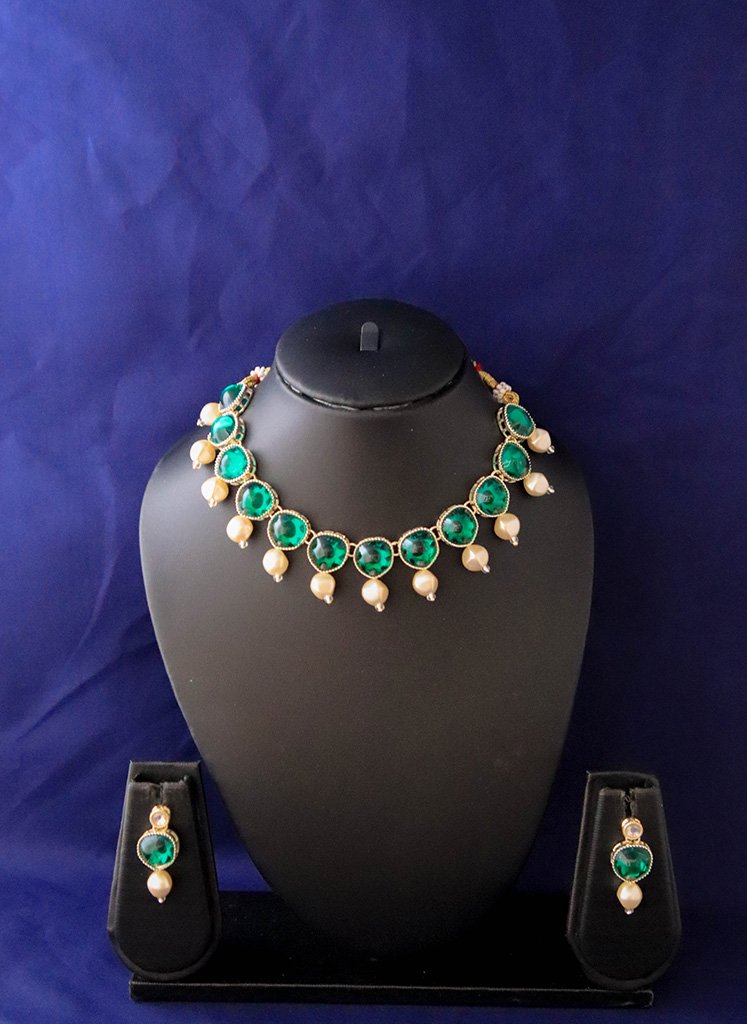 Elevate your ethnic ensemble with the Royal Solitaire Kundan Set, a stunning blend of traditional craftsmanship and contemporary elegance. This set features a choker-style necklace and matching drop earrings, meticulously designed to capture the light from every angle.
